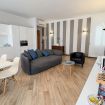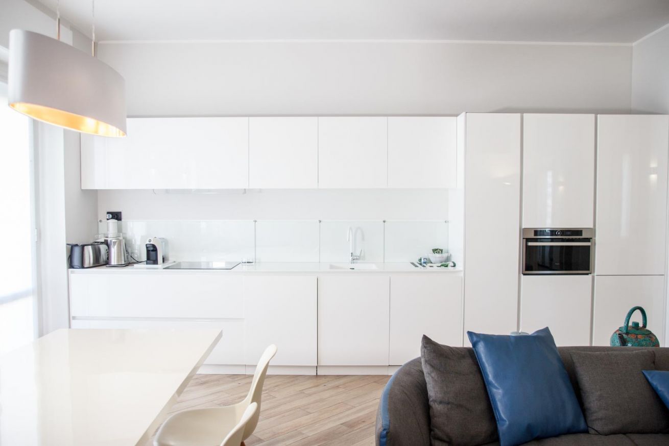 La cucina lineare, moderna e pulita è completamente attrezzata, mentre i bagni finemente rifiniti offrono materiali di qualità e un’estetica essenziale e contemporanea.